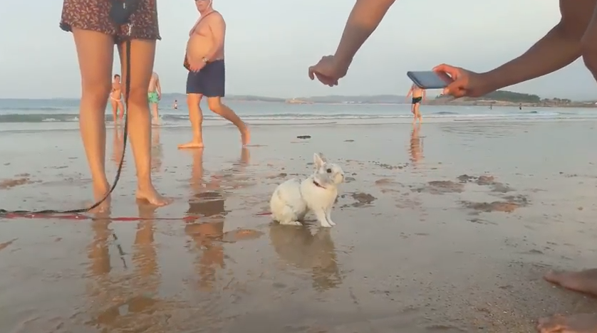 なぜだかおっさん爆笑。ビーチでうさんぽ。