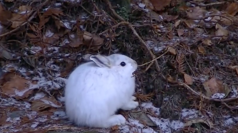 可愛らしいカンジキウサギ(snowshoe hare)の静かな動画。そこに珍客が…。