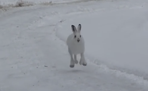 雪道の前方から気持ち良く走ってくる、真っ白な野うさぎちゃん。